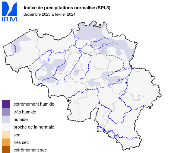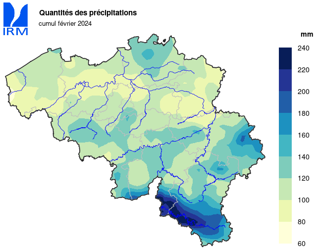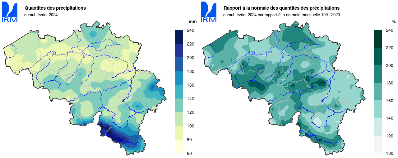 Dans notre pays, les précipitations mensuelles ont été partout supérieures à la normale. Les précipitations les plus faibles ont été enregistrées dans la région de la Gileppe et de la Warche (environ 145% de la normale), tandis que les précipitations les plus importantes ont été enregistrées dans le Tournaisis (environ 185% de la normale).