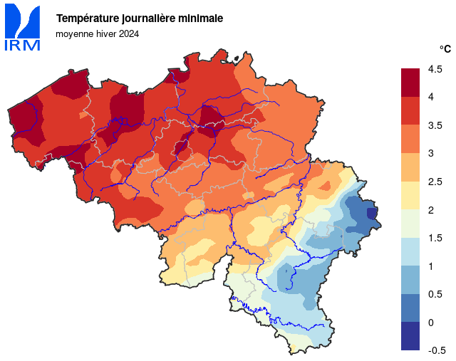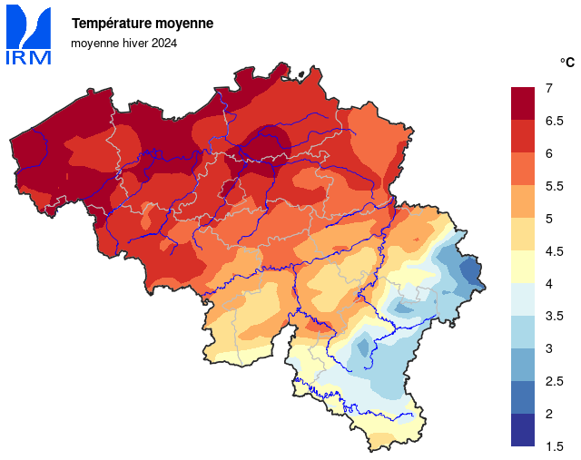 Fait remarquable : l'hiver dernier n'a enregistré que 17 jours de gel [min<0°C] à Uccle (normale : 29,7 jours). Ces jours ont été très inégalement répartis sur les trois mois d'hiver : 3 jours en décembre, 14 en janvier et aucun en février.
