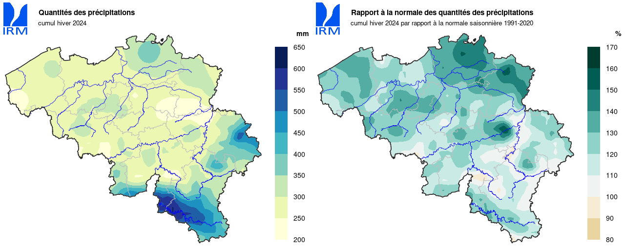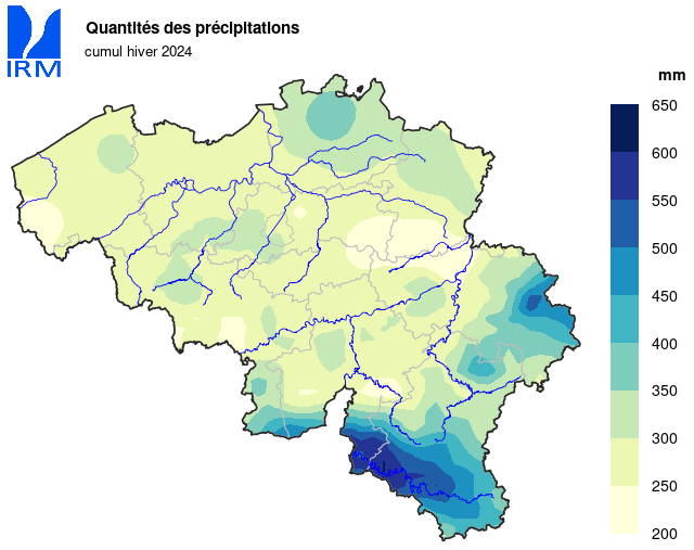 L'hiver dernier, Uccle a enregistré chaque mois des précipitations supérieures à leur normale, ce qui a rendu l'hiver beaucoup plus humide que la moyenne : 310,7 mm (normale : 228,6 mm), soit la troisième valeur la plus élevée depuis le début des observations en 1833, restant loin du record de 365,9 mm en 1995 et juste derrière 1910 (311,5 mm).