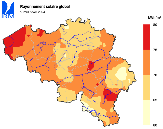 | Rayonnement solaire global | kWh/m² | 62.7 | 75.5 | -- | 89.8 | 2008 | 60.8 | 1994 |