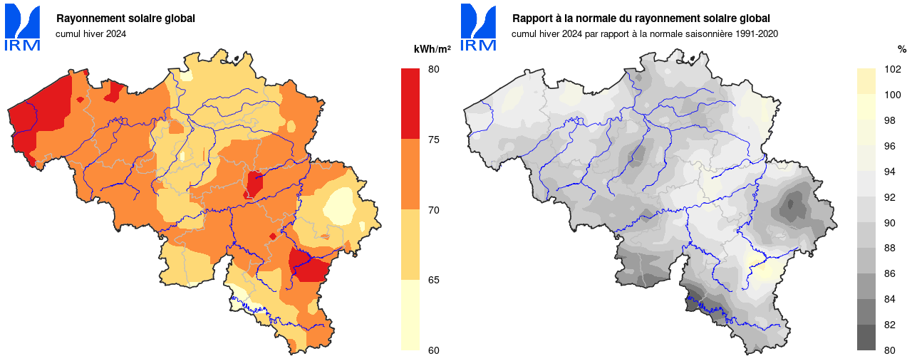 Tant en décembre (troisième mois de décembre le plus sombre pour la période de référence actuelle) qu'en février (deuxième mois de février le plus sombre depuis le début des observations), le soleil a très peu brillé à Uccle. Le mois de janvier, légèrement plus ensoleillé, n'a pas empêché l'hiver d'être globalement beaucoup plus sombre que la moyenne. Au final, le soleil n'a brillé à Uccle que 123h 21min (normale : 180h 17min). Cela en fait le deuxième hiver le plus sombre de la période de référence actuelle. Le record reste à 109h 31min en 1994.