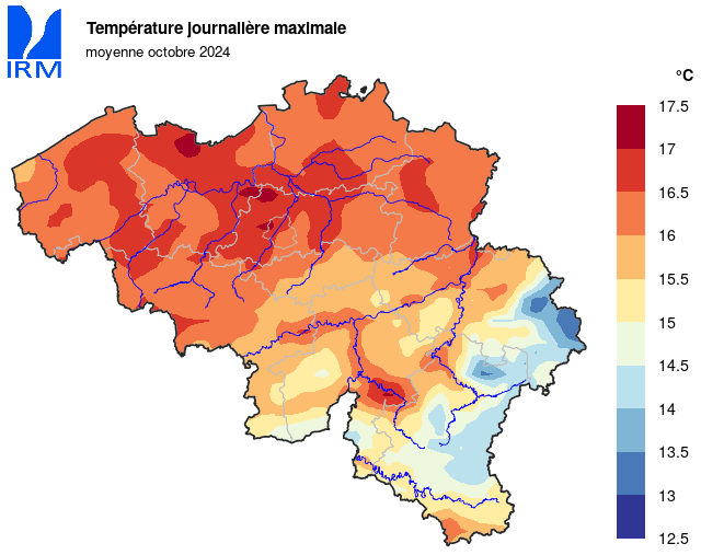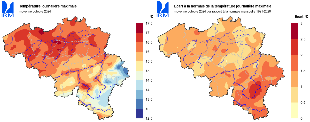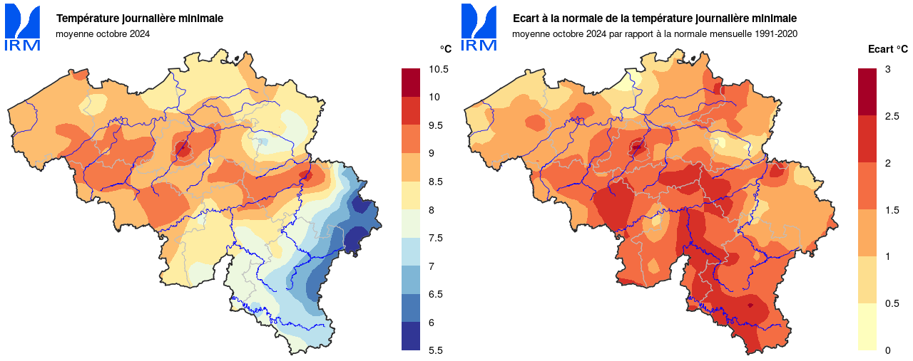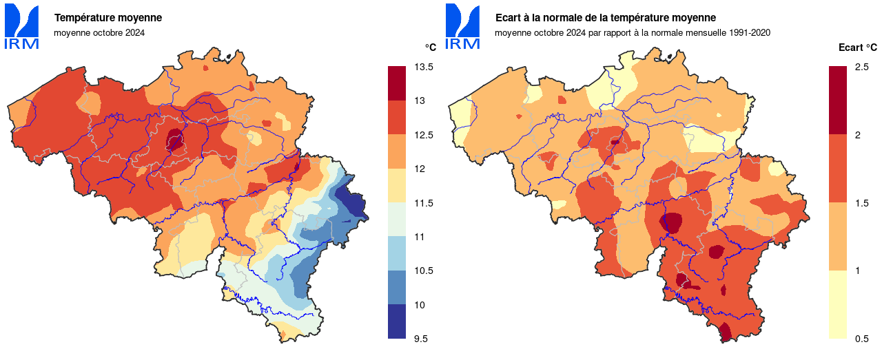 Sur l’ensemble de notre territoire, la température minimale la plus basse a été enregistrée le 6 octobre à Elsenborn (Bütgenbach) avec -2,4°C. Et la température maximale la plus élevée a été enregistrée le 16 octobre à Châtelet avec 24,3°C.