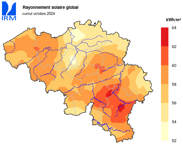 | Rayonnement solaire global | kWh/m² | 52 | 56.2 | - | 71.3 | 2018 | 33 | 1998 |