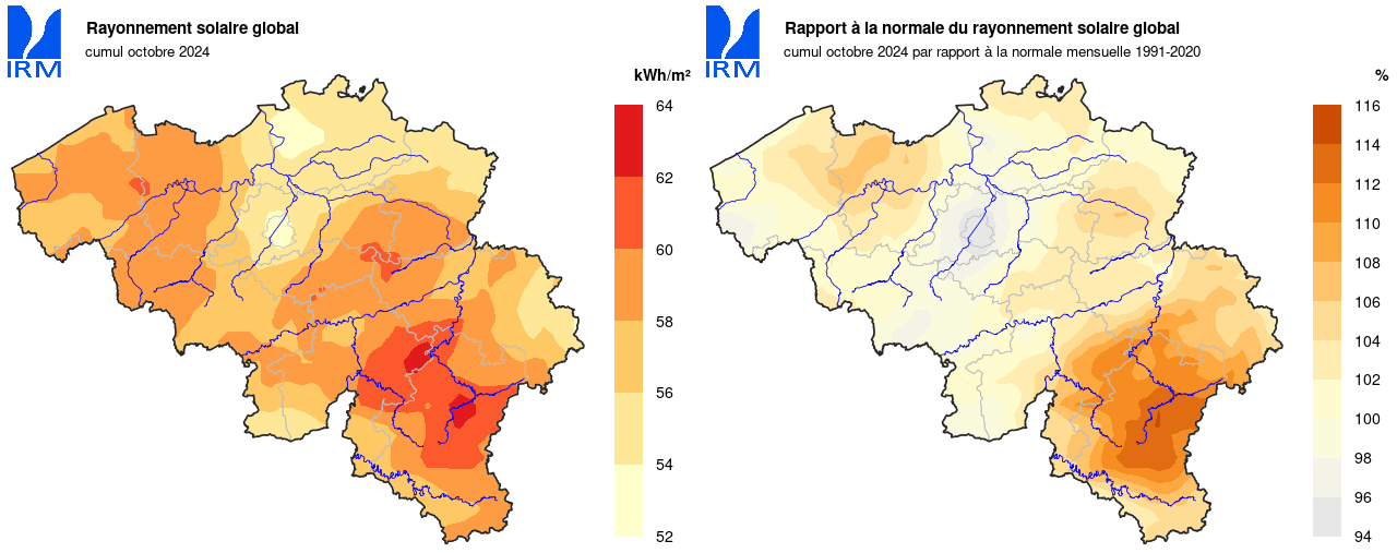 En considérant l’ensemble du réseau climatologique du l’IRM, le total journalier le plus élevé a été mesuré le 9 octobre. À Sugny (Vresse-sur-Semois), il est tombé 82,0 mm de précipitations.