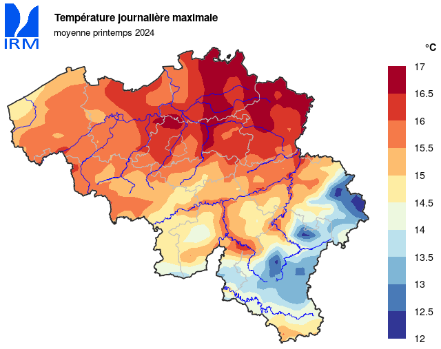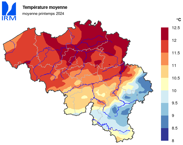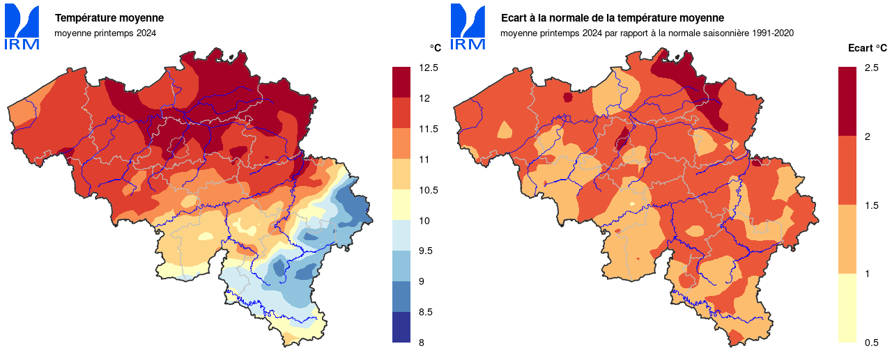 À Uccle, les températures ont été supérieures à leurs valeurs normales respectives pendant la majeure partie du printemps. Par conséquent, le printemps, dans son ensemble, a été plus chaud que la normale : 11,6°C contre une valeur normale de 10,5°C. Il s'agit du quatrième printemps le plus chaud depuis le début des observations en 1833. Le record se situe à 12,3 °C en 2007.