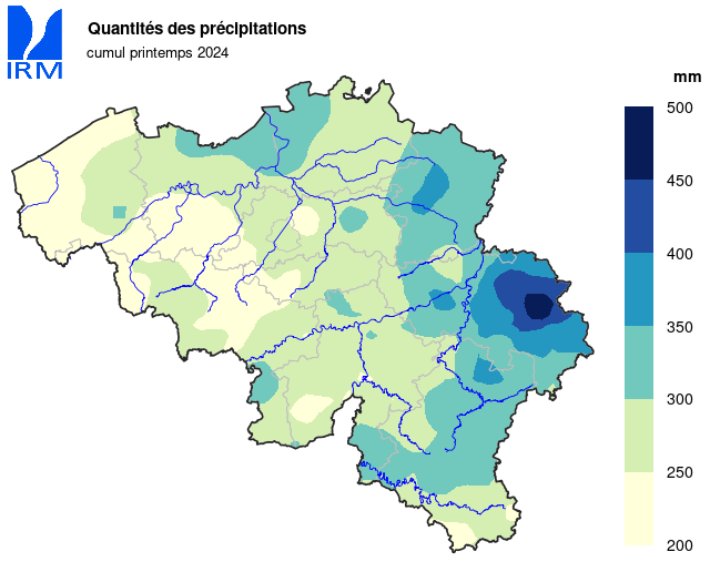 Au printemps dernier, Uccle a enregistré chaque mois des précipitations supérieures à la normale, ce qui a rendu le printemps beaucoup plus humide que la moyenne : 285,2 mm (normale : 165,6 mm). Il s'agit de la quantité la plus importante pour la période de référence actuelle (record précédent : 276,6 mm en 2001) et de la deuxième quantité la plus importante depuis le début des observations en 1833, derrière le record de 1965 avec 299,7 mm.