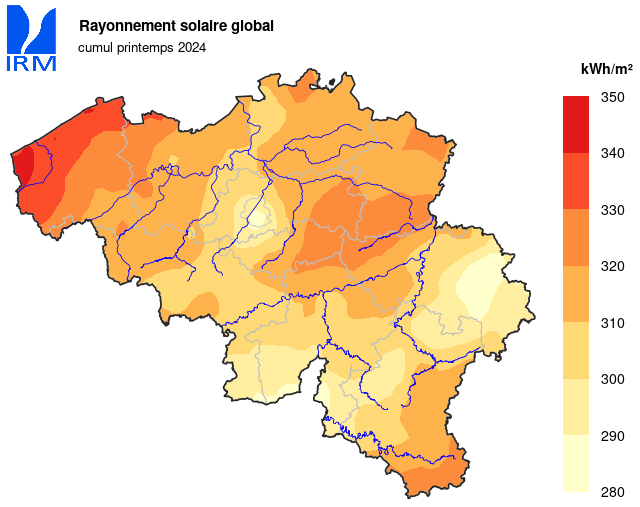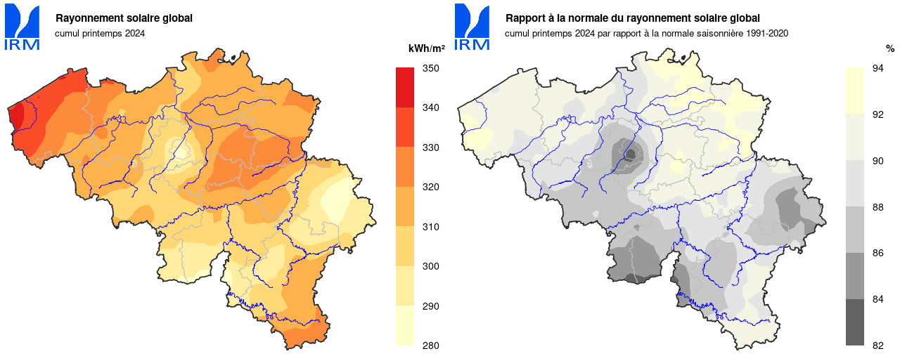 À Uccle, les trois mois de printemps ont été plus sombres que la moyenne. Par conséquent, le printemps dans son ensemble a également été beaucoup plus sombre que la moyenne. En fin de compte, le soleil n'a brillé que 367h 59min à Uccle (normale : 495h 19min). Il s'agit donc, de peu, du deuxième printemps le plus sombre de la période de référence actuelle. Le record reste à 364h 00min en 1998.