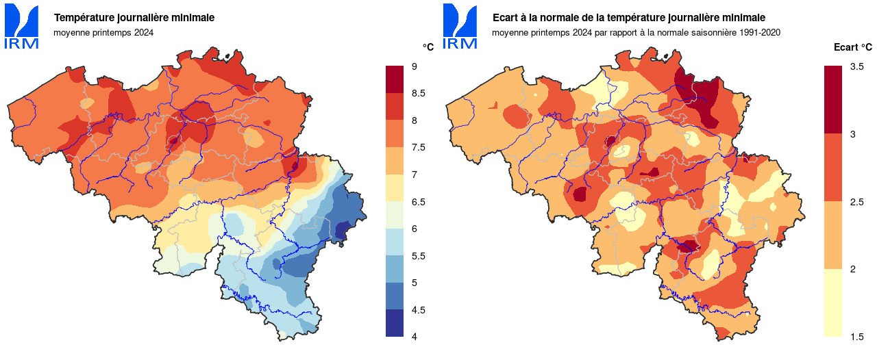 En raison de ces valeurs élevées, il n'est pas surprenant que la température minimale moyenne au printemps ait atteint un nouveau record absolu (mesures depuis 1892) : 8,1°C (normale : 6,2°C). Le précédent record de 7,4°C en 2007 a donc été largement battu.