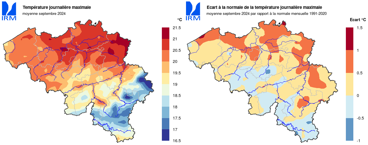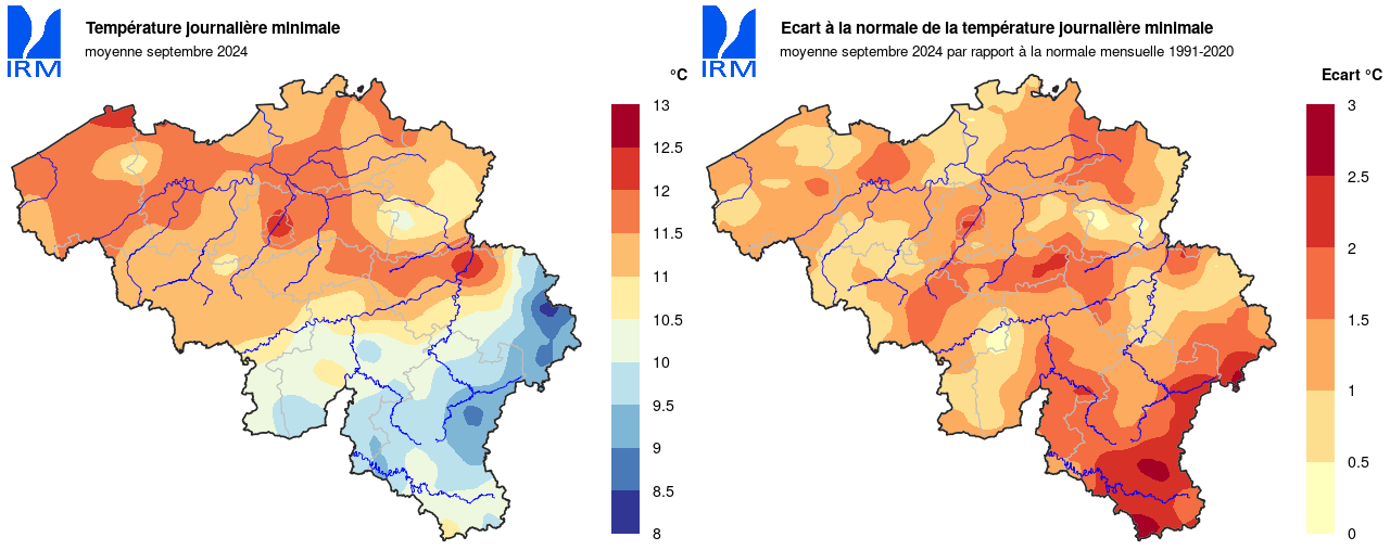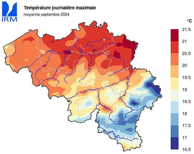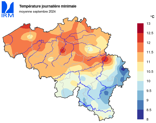 Sur l’ensemble de notre territoire, la température minimale la plus basse a été enregistrée le 29 septembre à Elsenborn (Bütgenbach) avec -1,7°C. La température maximale la plus élevée a été enregistrée le 1er septembre à Liège-Monsin (Liège) avec 33,8°C.