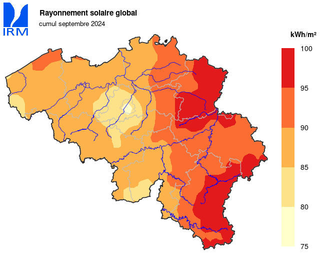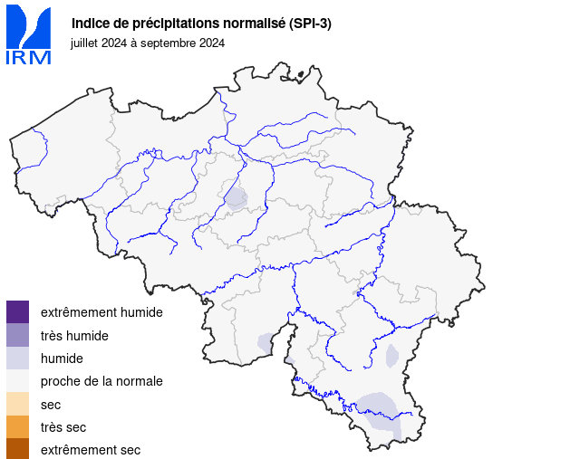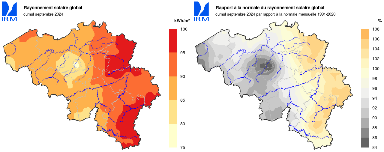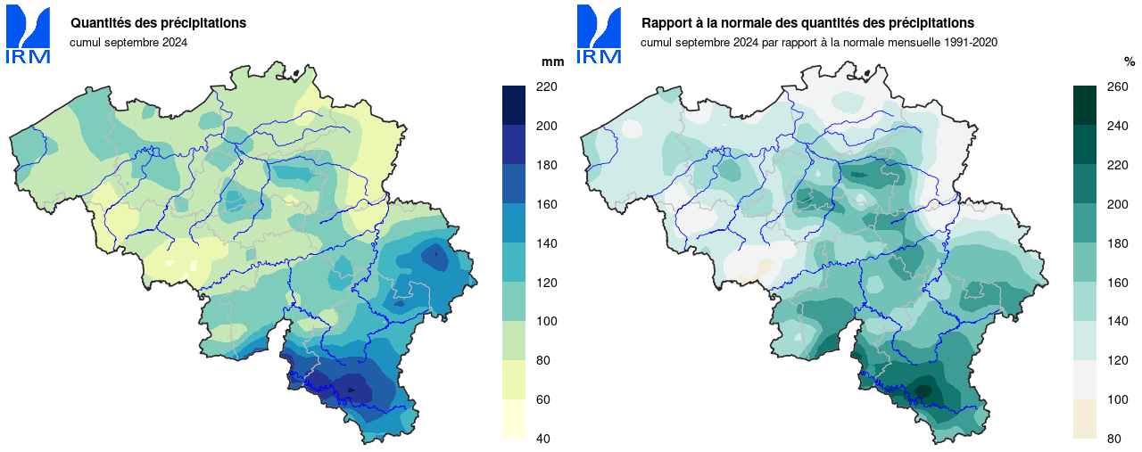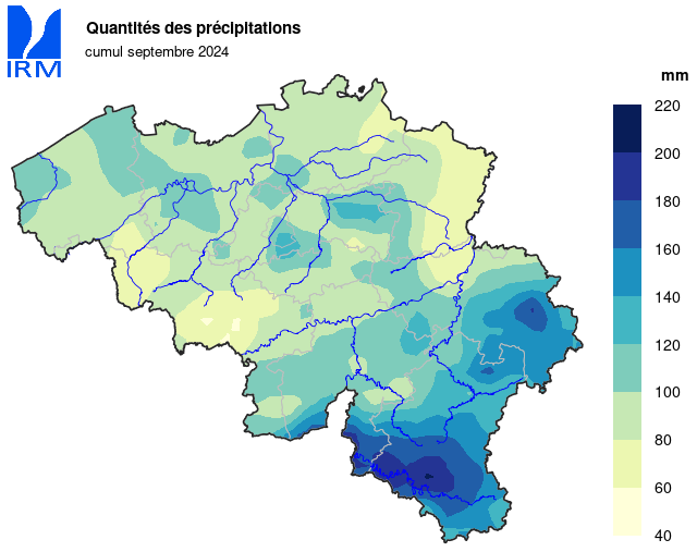 Fait remarquable : le cumul pluviométrique à Uccle pour les 9 premiers mois de l’année 2024 a déjà dépassé la normale annuelle : 941,3 mm par rapport à une normale annuelle de 837,1 mm. Si les précipitations des 3 prochains mois suivent les valeurs normales, le record absolu de 1088,5 mm en 2001 (mesures depuis 1833) sera atteint.