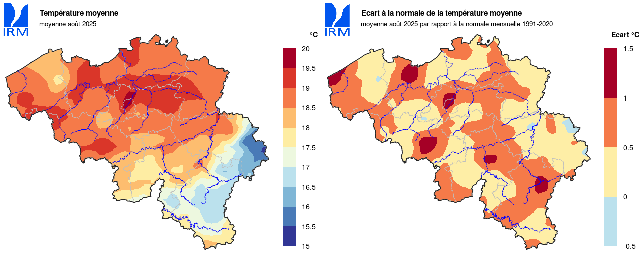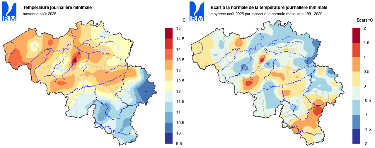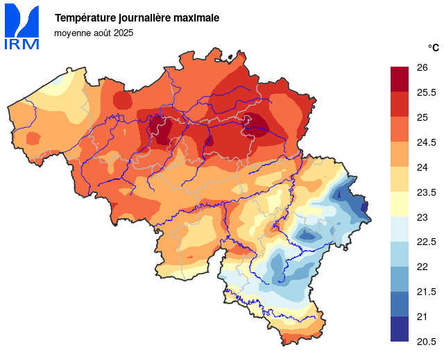 Sur l’ensemble de notre territoire, la température minimale la plus basse a été enregistrée le 25 août à Elsenborn (Bütgenbach) avec 0,0 °C. La température maximale la plus élevée a été enregistrée le 12 août à Dilbeek avec 35,0 °C.