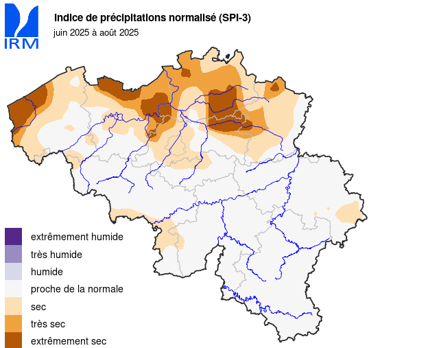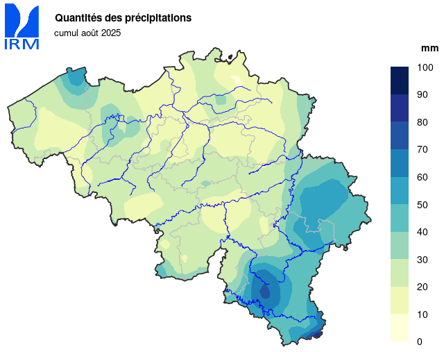 Sur l’ensemble de notre territoire, les totaux mensuels de précipitations ont partout été largement inférieurs à la normale. Dans la plupart des régions, il n'est tombé que 25 % à 30 % de la quantité normale de précipitations. La plupart des précipitations sont tombées en Lorraine belge (environ 64 % de la quantité normale).