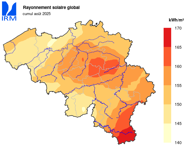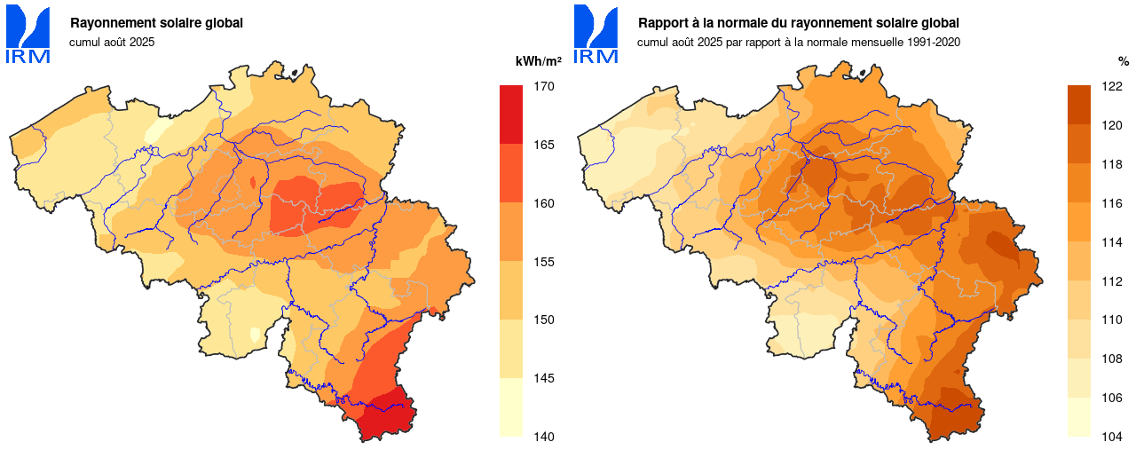 À Uccle, le mois d'août a été plus ensoleillé que la moyenne : 233 h 32 min (normale : 192 h 26 min). La deuxième décade s'est particulièrement démarquée : avec une durée d'ensoleillement de 98 h 03 min, elle a été la troisième deuxième décade d'août la plus ensoleillée de la période de référence actuelle. Seules les années 1997 (avec 110 h 50 min) et 1995 (101 h 20 min) ont été plus ensoleillées.