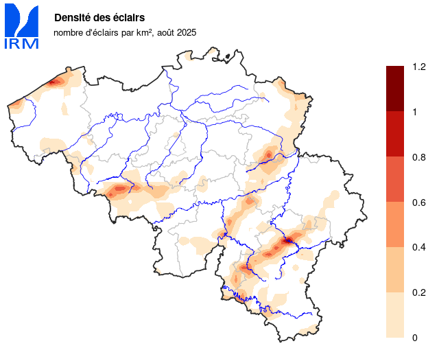 Sur l’ensemble du réseau climatologique de l’IRM, le total journalier le plus élevé a été enregistré le 29 août à De Haan (45,4 mm).