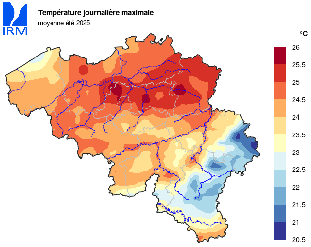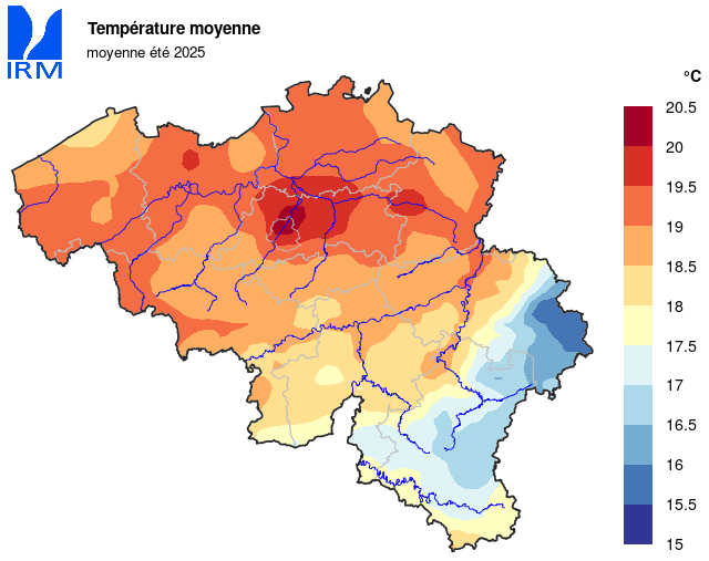 La température moyenne de l'été 2025, à Uccle, s’est élevée à 19,3 °C (normale : 17,9 °C). Cela fait de l'été 2025 le quatrième été le plus chaud depuis le début des mesures en 1833. Seuls les étés 2018 (19,9 °C), 2003 (19,7 °C) et 2022 (19,6 °C) ont été plus chauds.