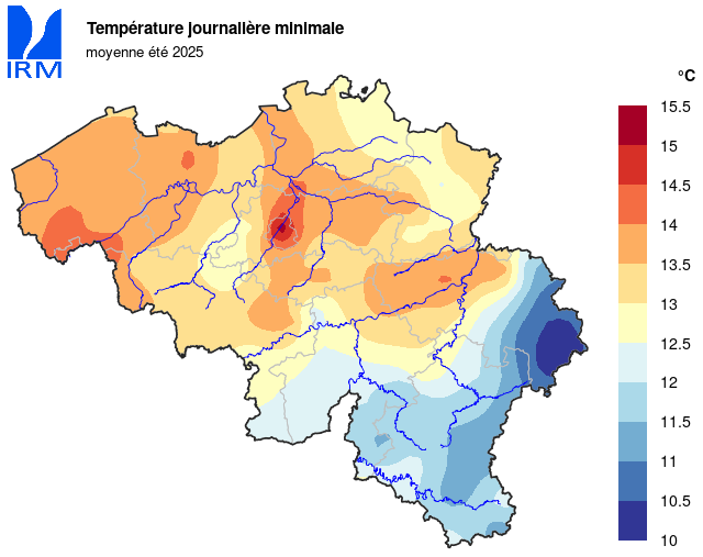 Sur l’ensemble de notre territoire, la température la plus élevée a été enregistrée le 2 juillet (38,3°C à Diepenbeek) et la température plus basse le 25 août (0,6°C à Elsenborn (Bütgenbach)).