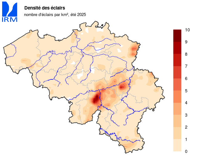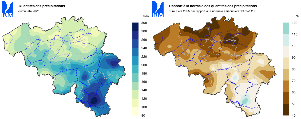 Sur l’ensemble de notre territoire, les précipitations les plus faibles ont été enregistrées dans les polders et en Campine (environ 50 % de la quantité normale), tandis que les précipitations les plus importantes ont été enregistrées dans les Ardennes et en Lorraine belge (environ 90 % de la quantité normale).