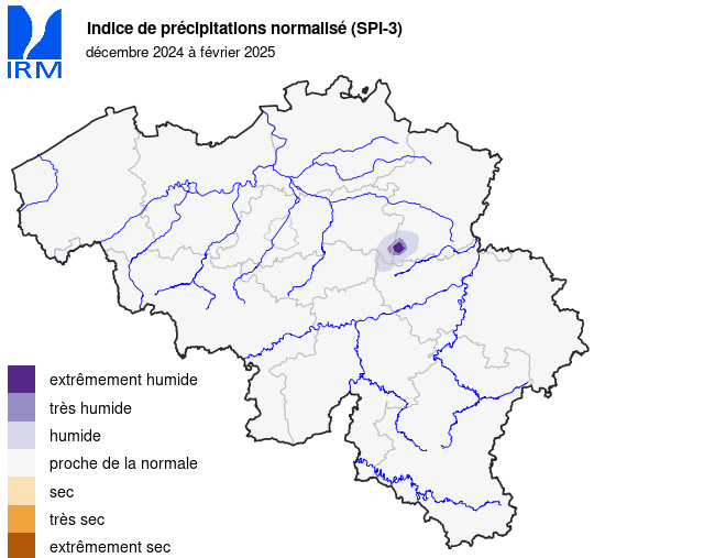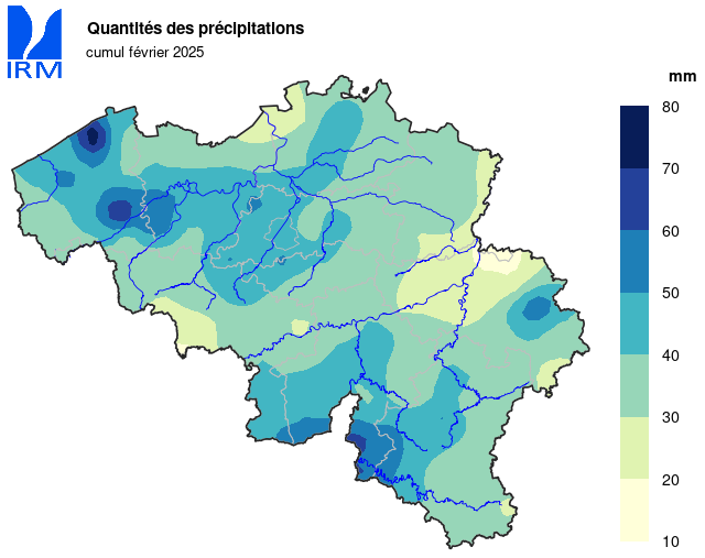 Dans le réseau d’observations climatologiques de l’IRM, le plus grand total journalier a été enregistré le 10 février à Herent (28,0 mm).