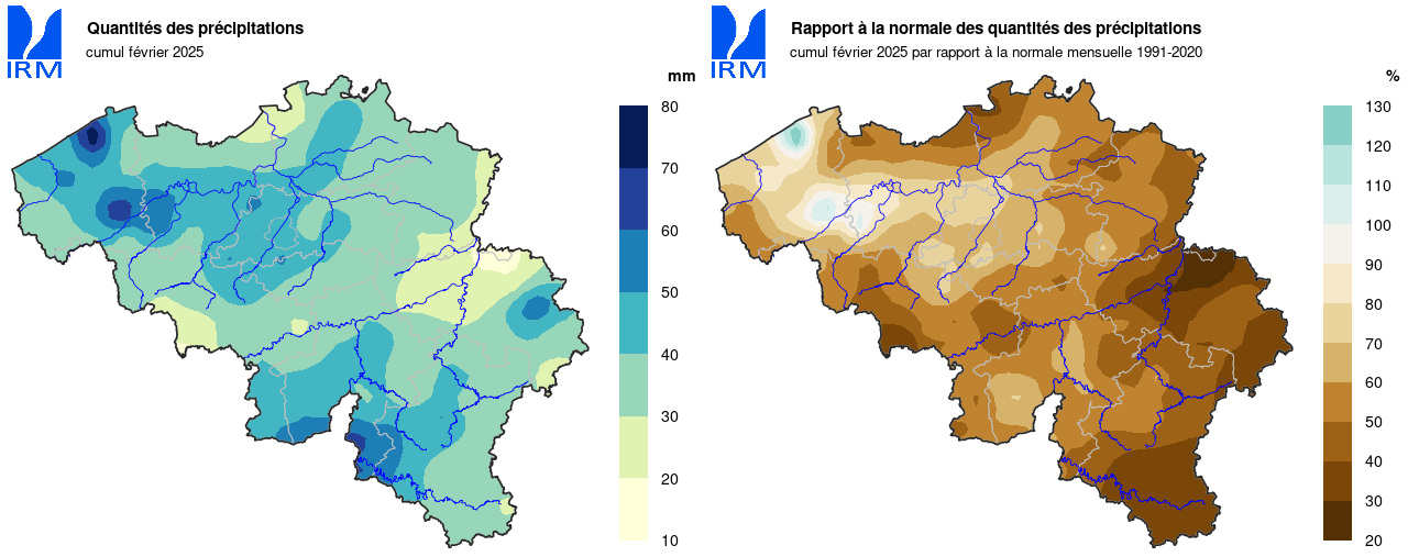Dans notre pays, les cumuls mensuels de précipitations ont été partout très inférieurs aux normales. Les précipitations les plus faibles ont été enregistrées dans le Pays de Herve (environ 30 % de la normale), tandis que les précipitations les plus importantes ont été enregistrées dans les Flandres (environ 70 % de la normale).