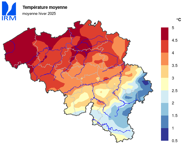 Dans notre pays, la température la plus basse a été enregistrée le 14 janvier : -15,3°C à Elsenborn (Bütgenbach). La température la plus élevée de 19,8°C a été enregistrée le 21 février à Kapelle-op-den-Bos dans le Brabant flamand.