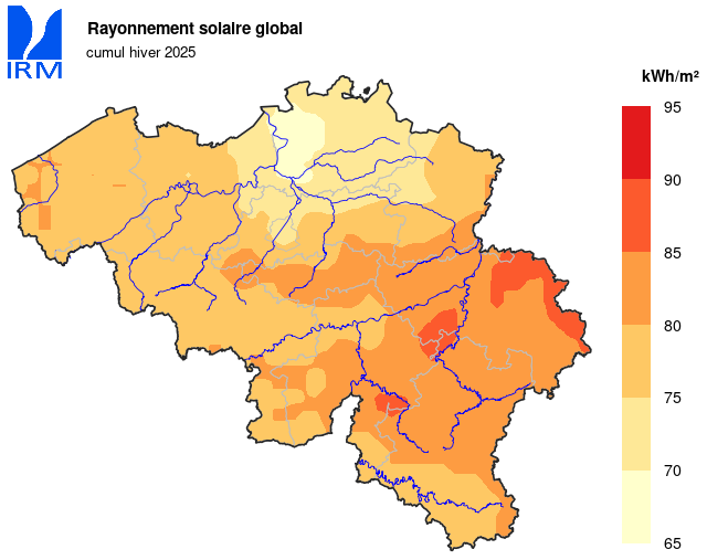 La quantité totale de précipitations relevées à Uccle cet hiver s’élève à 278,3 mm (normale : 228,6 mm).
