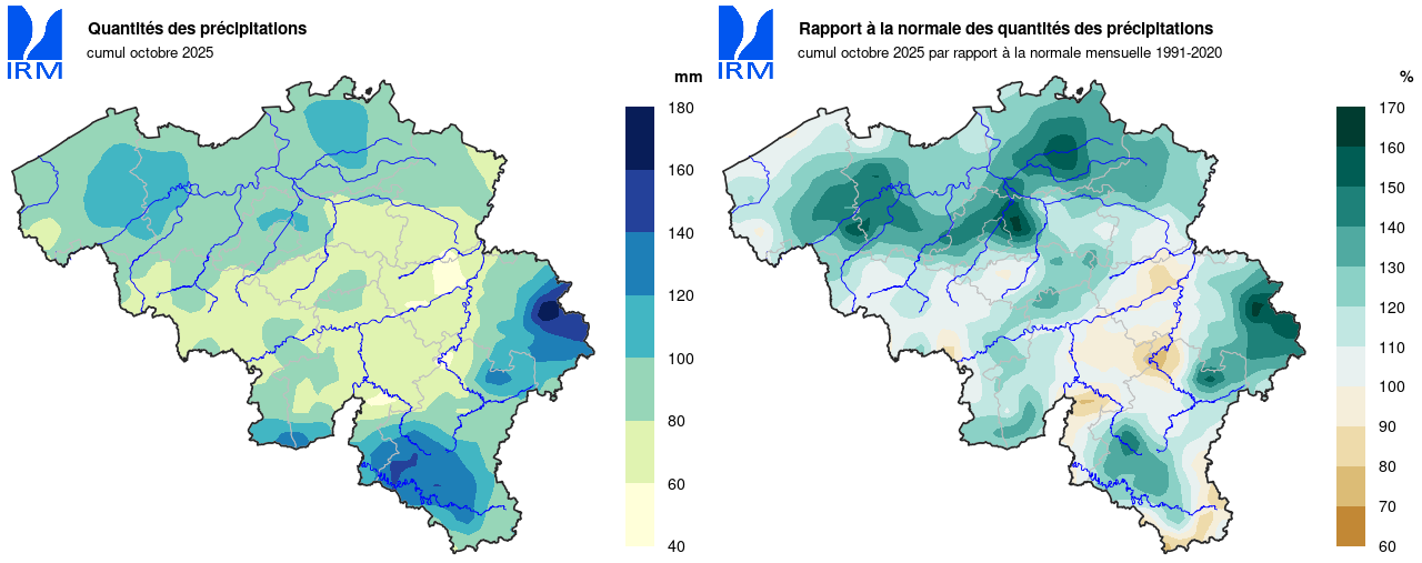 Sur l’ensemble de notre territoire, les précipitations mensuelles totales ont été proches ou supérieures à la normale. Les précipitations les plus faibles ont été enregistrées en Lorraine belge et dans le Condroz (environ 98 % de la normale) et les plus importantes dans la région de la Gileppe et de la Warche (environ 136 % de la normale).