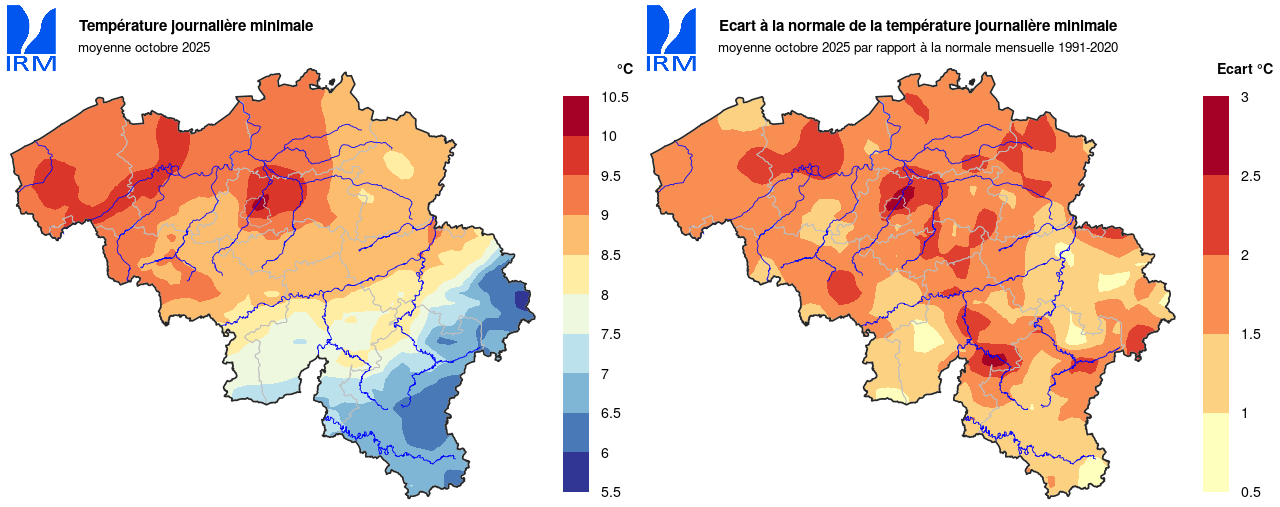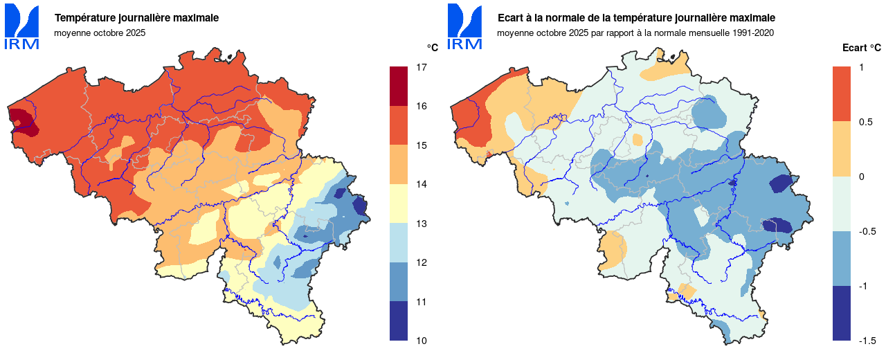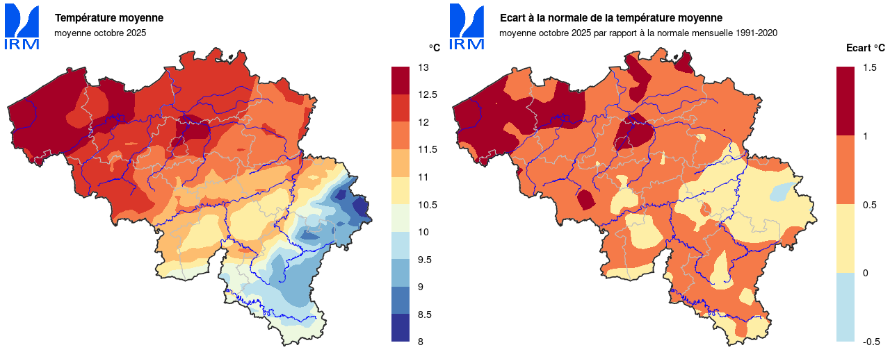 À Uccle, la température moyenne du mois d'octobre était de 12,0°C (normale : 11,3°C). Les températures moyennes ont été supérieures à leurs normales respectives pendant la majeure partie du mois. Seuls le début du mois et la période du 24 au 27 octobre ont été légèrement plus froids que la normale.