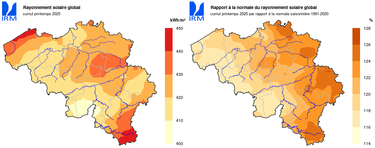 À Uccle, les trois mois de printemps ont été beaucoup plus ensoleillés que la moyenne. Mars et avril ont été chacun le troisième mois le plus ensoleillé pour la période de référence actuelle, et le mois de mai a également été très ensoleillé. Le printemps, dans son ensemble, a donc également été beaucoup plus ensoleillé que la moyenne : 688h 35min (normale : 495h 19min). Il s'agit du troisième printemps le plus ensoleillé depuis le début des observations (1887). Seules les années 2020 (740h 48min) et 2011 (707h 16min) ont été encore plus ensoleillées.