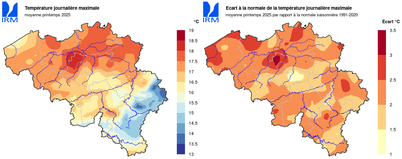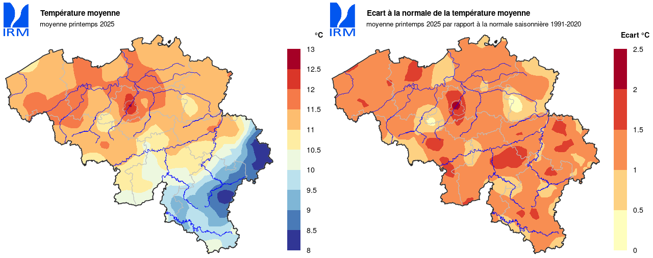 Pendant la majeure partie du printemps, les températures ont été supérieures à la normale à Uccle. Par conséquent, la température moyenne finale de cette saison a également été supérieure à la normale : 11,8°C (normale : 10,5°C). Il s'agit de la troisième valeur la plus élevée depuis le début de ces mesures en 1833. Le record reste de 12,3°C en 2007 et le printemps 2011 a également été plus chaud (12,2°C).
