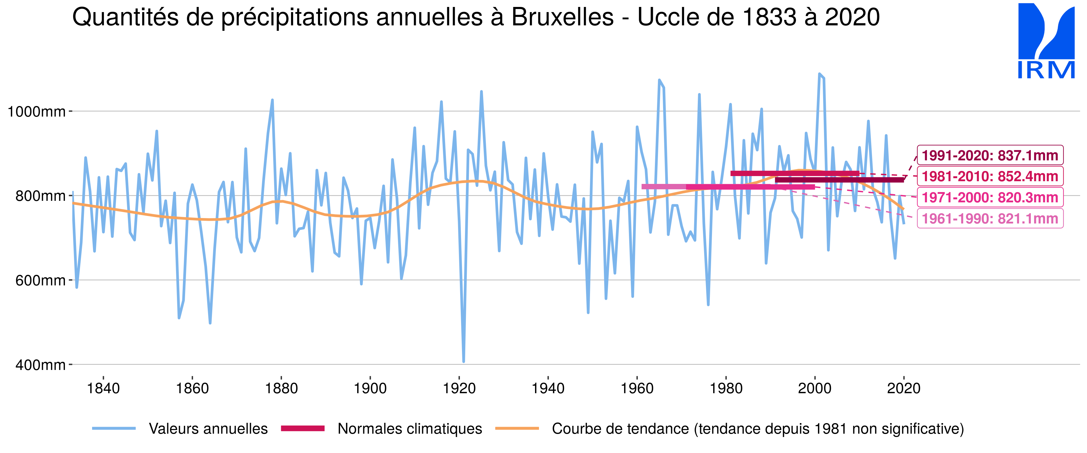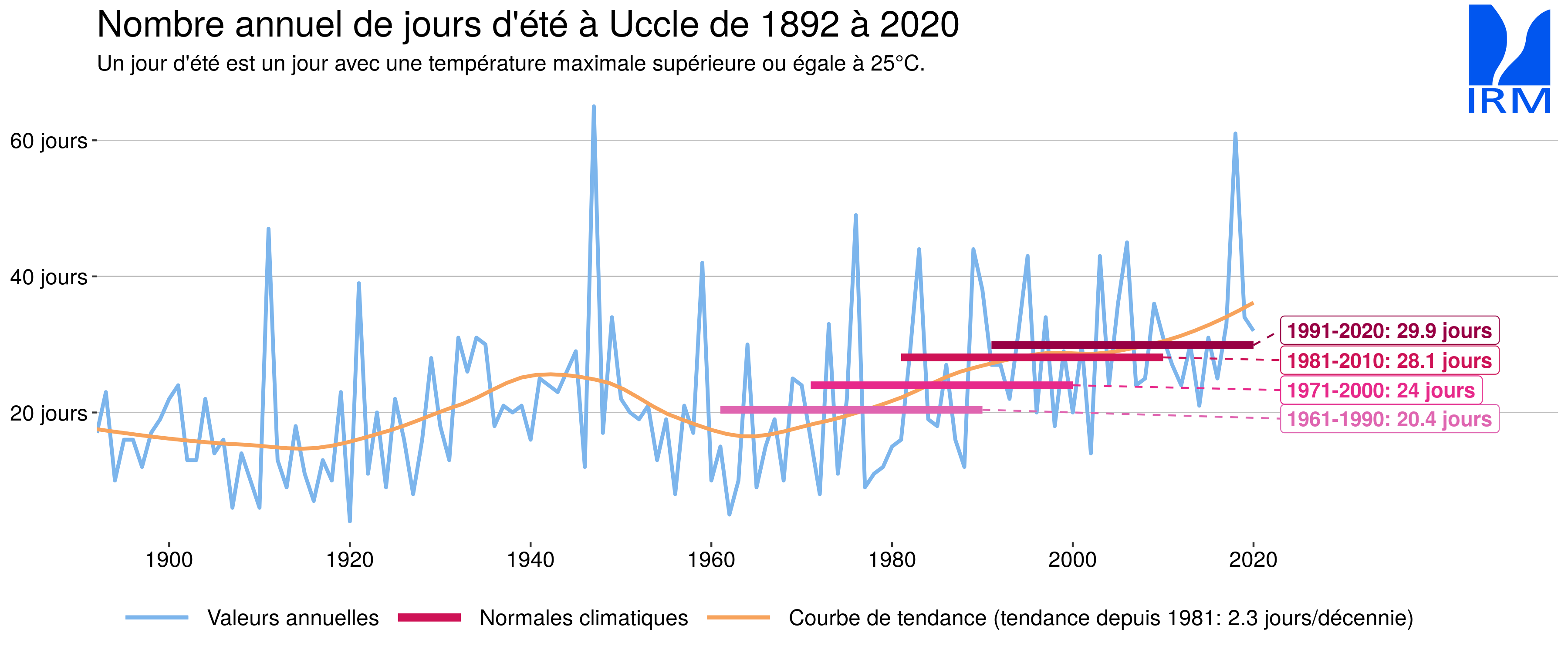 Tous les dix ans, l’IRM calcule les nouvelles normales pour les principales variables du climat (température, quantité de précipitation, durée d’insolation, vitesse du vent, pression atmosphérique…) ainsi que pour une série d'indices, comme par exemple le nombre de jours d’été. Cette actualisation est définie au niveau international par l’Organisation Météorologique Mondiale.