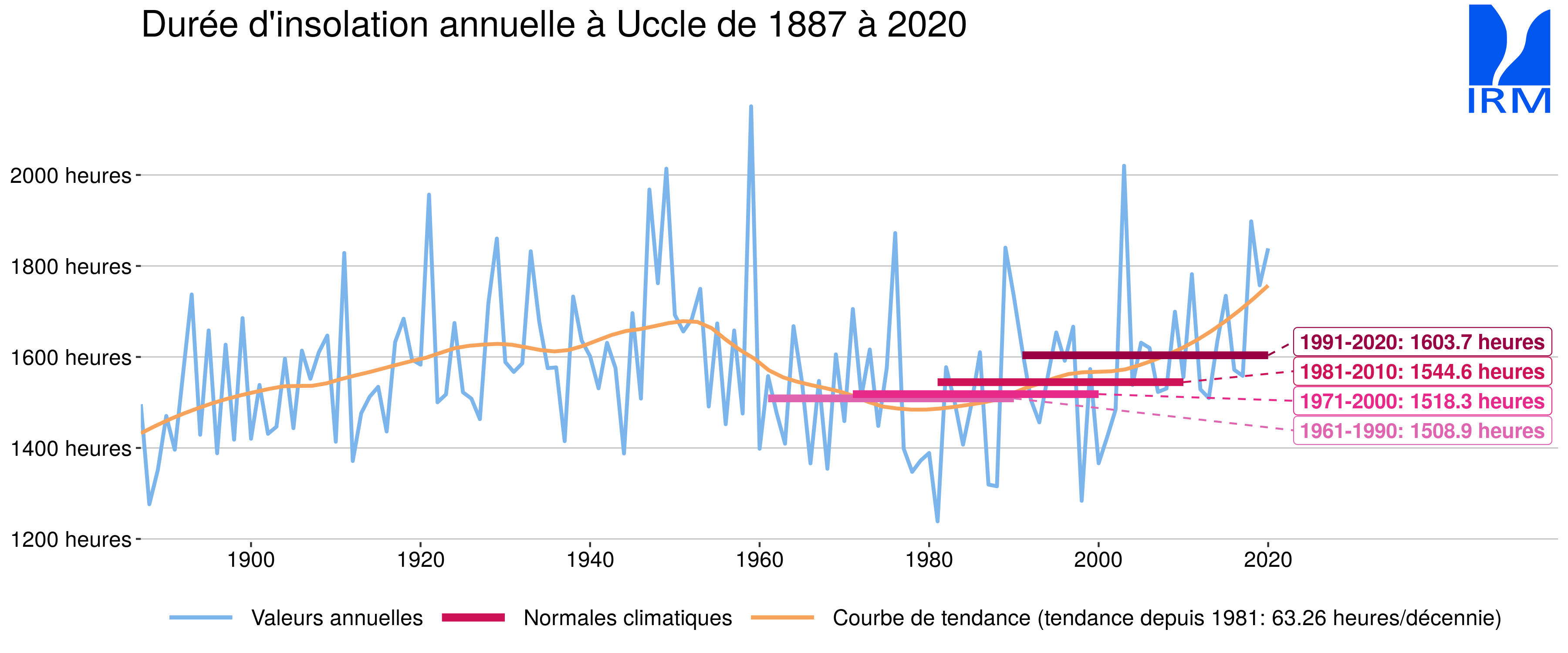 Enfin, il y a eu une nette augmentation du nombre d'heures d'insolation depuis les années 1980. Au cours des 30 dernières années, la durée d'ensoleillement a augmenté de 94 heures à Uccle par rapport à la période 1961-1990, dont plus de la moitié de l'augmentation a eu lieu depuis la période 1981-2010. Cette augmentation de l'énergie solaire atteignant la surface de la Terre est en partie due à une amélioration de la qualité de l'air dans nos régions, grâce aux efforts de réduction des émissions de polluants atmosphériques.