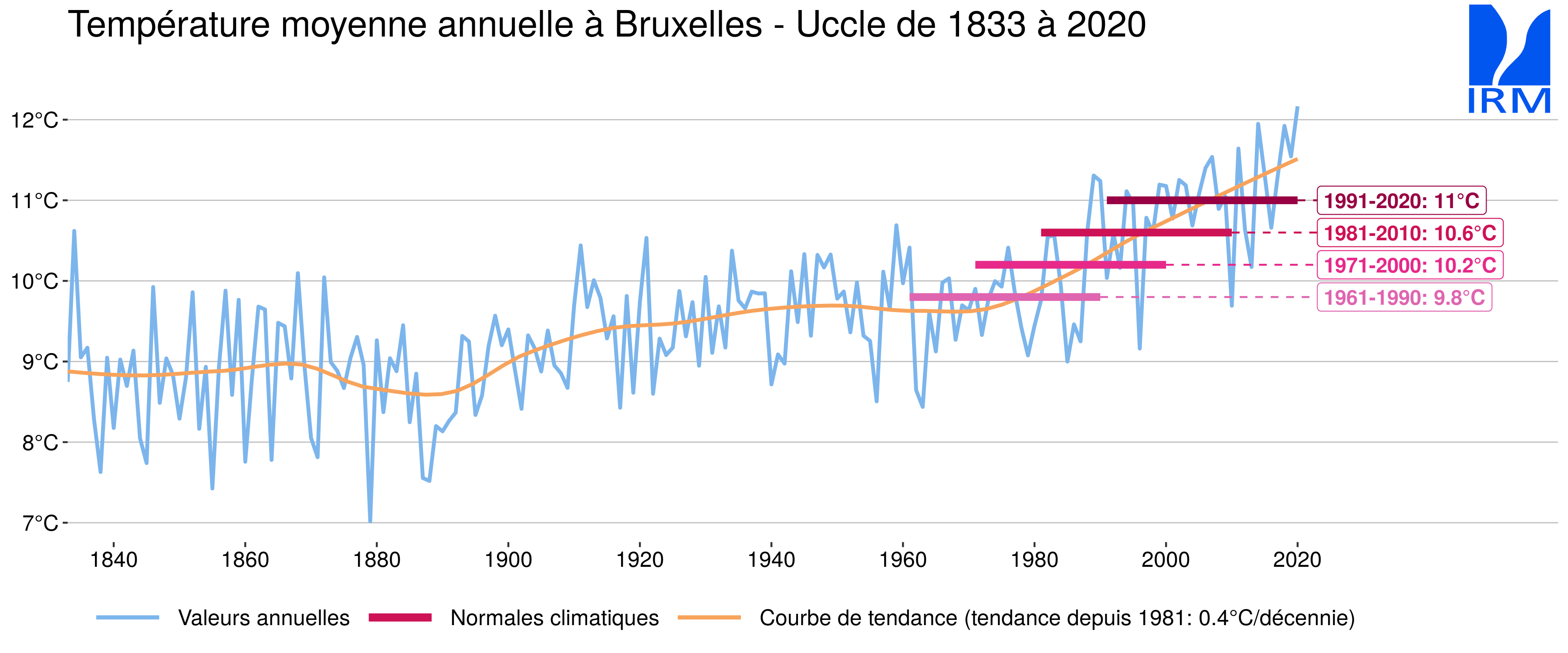 Le changement climatique se remarque surtout au niveau des températures. Par exemple, une des figures ci-dessus montre l'évolution de la température moyenne annuelle à Uccle depuis 1833 ainsi que les quatre dernières valeurs normales depuis 1961 (lignes horizontales roses et rouges). Il est clair que depuis les années 1970, la température moyenne à Uccle n'a cessé d'augmenter, avec un réchauffement moyen de 1,2 °C aujourd'hui par rapport à 1961-1990.