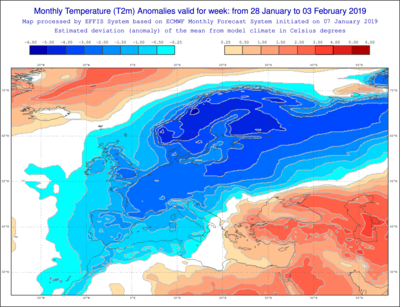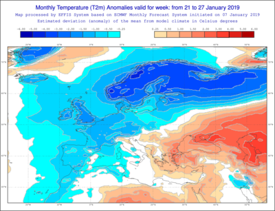 Figure 2. Cartes du modèle de prévision à long-terme ECMWF du 7 janvier concernant la prévision des anomalies de température (par rapport à la normale) pour la période du 21 au 27 janvier ainsi que pour la période du 28 janvier au 3 février.