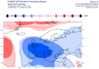 Figure 3. Cartes du modèle de prévision à long-terme ECMWF du 14 janvier concernant la prévision des anomalies de pression (par rapport à la normale) pour la période du 14 au 20 janvier ainsi que pour la période du 21 janvier au 27 janvier.
