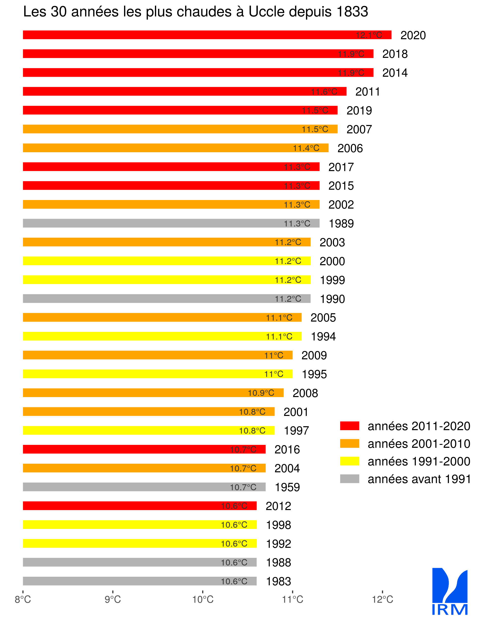 La figure ci-dessous montre les 30 années les plus chaudes mesurées à Uccle depuis 1833. Lorsqu'une température annuelle moyenne est égale entre deux années ou plus, il n'y a pas d'ordre d'importance et l'année la plus récente est indiquée en premier. Comme le montre la figure, les 5 et 10 années les plus chaudes à Uccle se sont toutes déroulées respectivement après 2010 et après 2000.