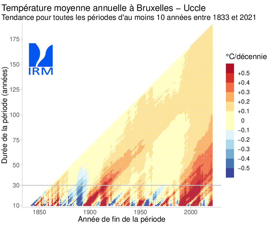 Pour illustrer l'importance d'une période suffisamment longue dans les tendances climatiques, la figure ci-dessus montre l'évolution de la température moyenne annuelle à Uccle pour une période d'au moins 10 ans ou plus (axe des ordonnées) entre 1833 et 2021 (axe des abscisses). Chaque point coloré correspond à la tendance de la température pour une période, où la valeur sur l'axe vertical est la longueur de la période, la valeur sur l'axe horizontal est la dernière année de la période respective, et la couleur du point est la valeur de la tendance linéaire. Par exemple, le point (1950, 30) donne la tendance sur la période 1921-1950. Le haut du triangle donne la tendance sur la période totale 1833-2021. Pour les périodes inférieures à 30 ans, sous la ligne horizontale grise, on observe à la fois un réchauffement (rouge) et un refroidissement (bleu). Les périodes de plus de 30 ans montrent presque toutes un réchauffement. En outre, plus les périodes sont récentes, plus le réchauffement est important. Par exemple, pour les 31 dernières années (1991-2021), le réchauffement est de +3,4 °C par 100 ans.
