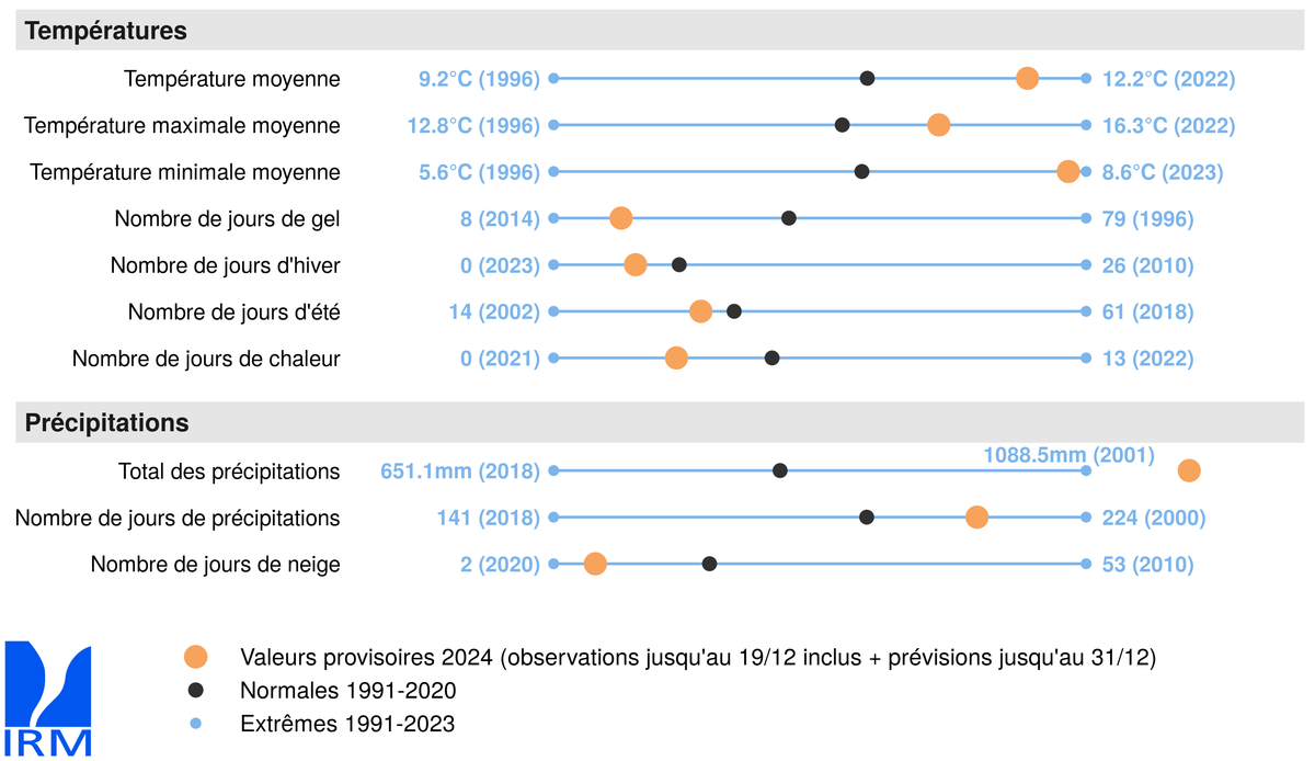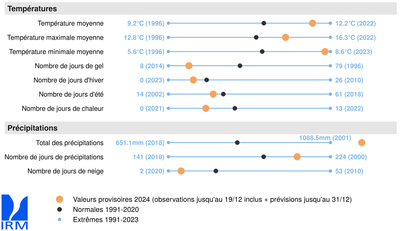 D'après les observations faites à Uccle jusqu'au 19 décembre 2024 et les prévisions pour le reste de l'année, 2024, avec une température moyenne de 11,9°C, devrait être la sixième année la plus chaude depuis le début des relevés en 1833. Les années record restent 2022 et 2020 avec une température moyenne de 12,2°C. Avec une température minimale moyenne provisoire de 8,5°C, l’année se terminera en deuxième place, ex aequo avec 2014. Le record date de 2023 avec une valeur de 8,6°C.