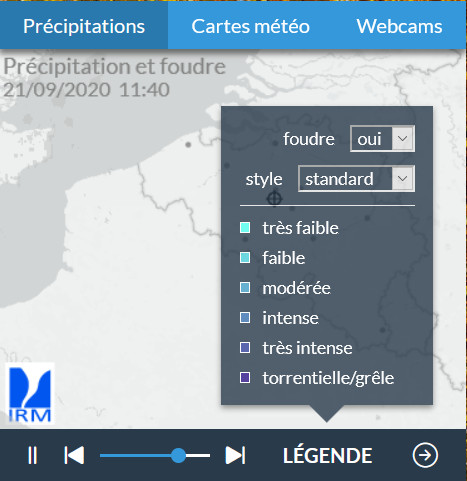 Lorsque que vous cliquez sur la flèche entourée d’un cercle, à droite de la légende, vous serez redirigé vers la page des observations de précipitations. Aussi directement accessible via l’onglet Météo – Observations – Précipitations radar.