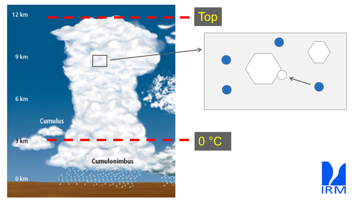 Les particules de glace grossissent au sein des cumulonimbus en collectant des gouttelettes liquides en surfusion.