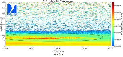 Cette observation a été confirmée à l'aide de notre modèle opérationnel de transport et de dispersion atmosphérique. L'heure d'observation de l'arrivée du panache de fumée à Zeebruges (Bruges) correspondait exactement à l'heure d'arrivée prévue par la modélisation. Ce qui démontre à nouveau la capacité de l'IRM a effectuer le suivi des nuages d'aérosols en altitude par l'observation et la modélisation permettant ainsi d'anticiper le déplacement de nuages d'aérosols potentiellement dangereux pour l'aviation mais aussi pour la santé si les conditions météorologiques sont favorables à le rabattre vers le sol.
