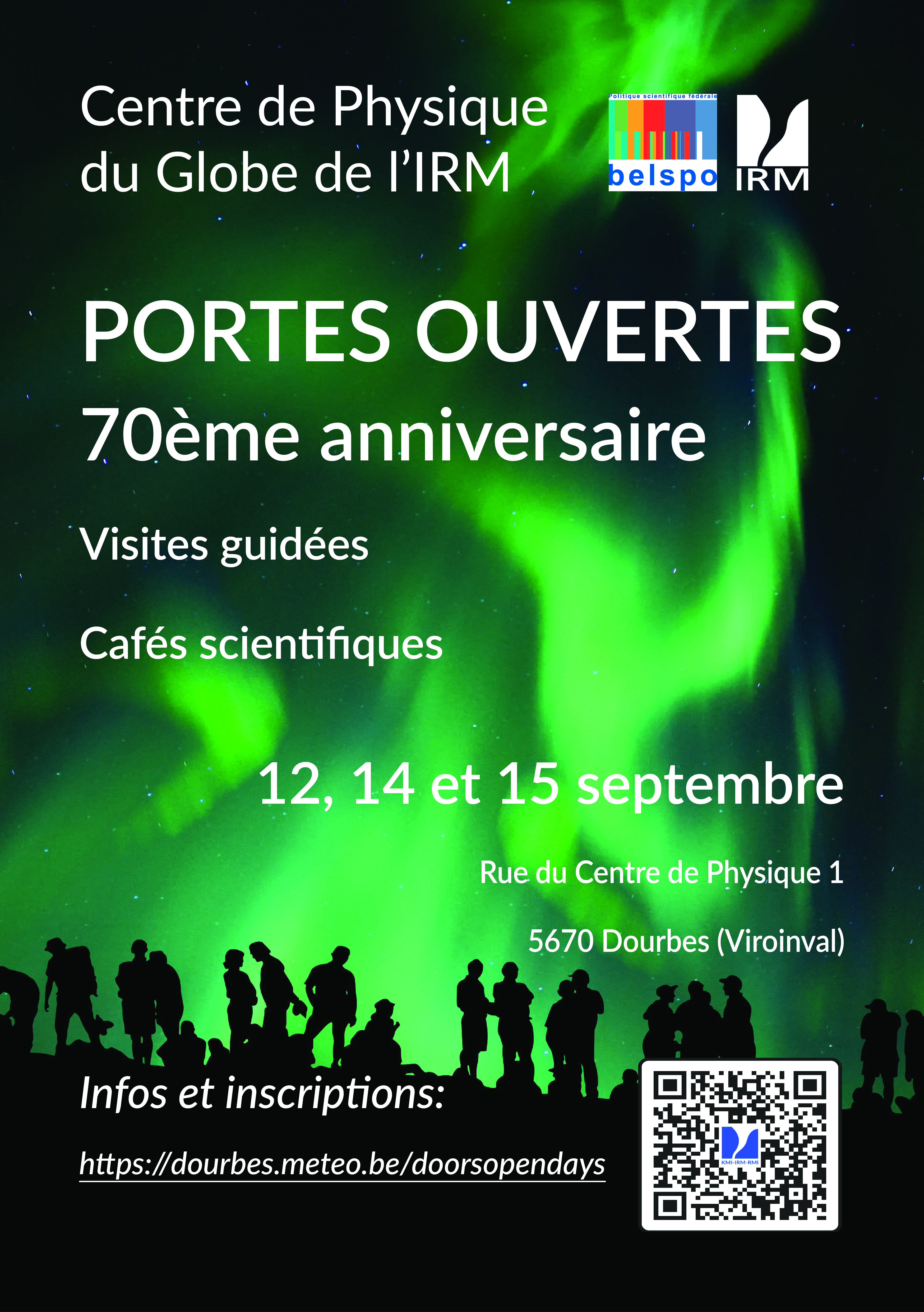 À l'occasion du 70ème anniversaire du Centre de Physique du Globe de l'Institut Royal Météorologique (IRM), nous vous invitons à nos Journées Portes Ouvertes 2024. Cet événement se déroulera les 12, 14 et 15 septembre au Centre de Physique du Globe, situé au 1 rue du Centre Physique, B-5670 Dourbes (Viroinval).