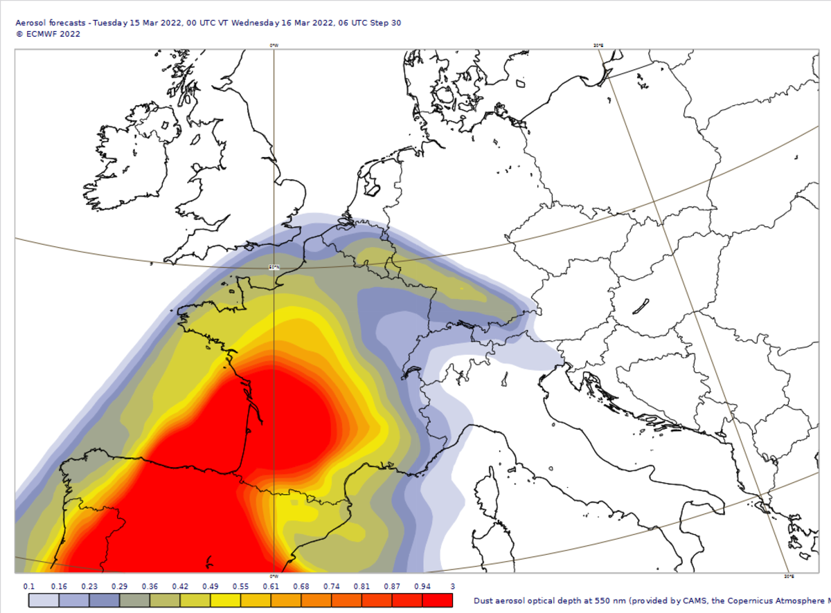 Prévision d'air chaud avec de la poussière du Sahara sur l'Europe pour le mercredi 16 mars (Source : Copernicus Atmosphere Monitoring Service))