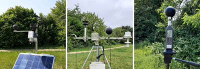 Fig. 1. Différents types de stations météorologiques utilisées durant la campagne : de gauche à droite, les stations fixes VLINDER et Campbell, et l’appareil portable AT-HTS01, dont 17 exemplaires ont été déployés. Les appareils mesurent la température de l’air, la radiation, l’humidité et la vitesse du vent au moyen de capteurs de température, thermomètres à globe noir, pyranomètres, capteurs d’humidité et anémomètres.