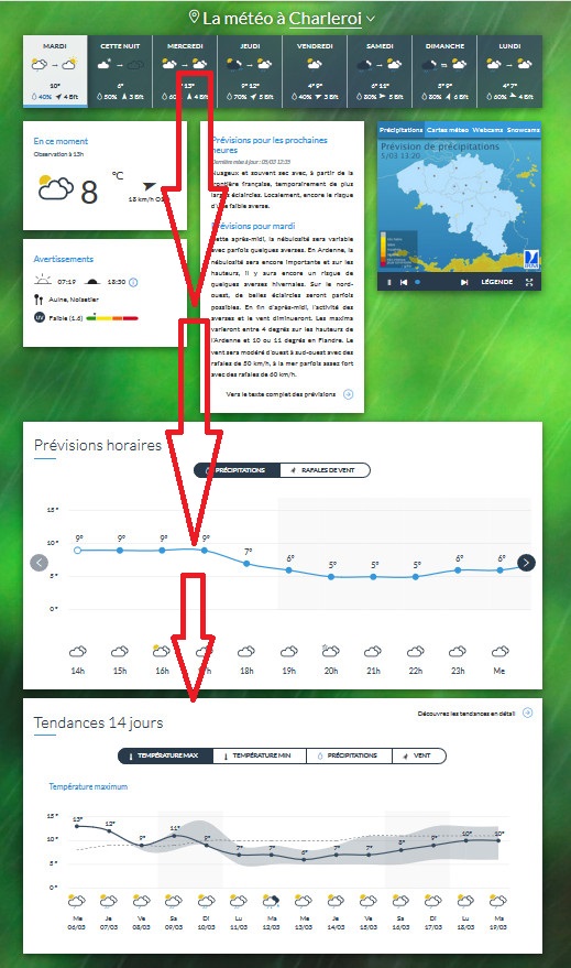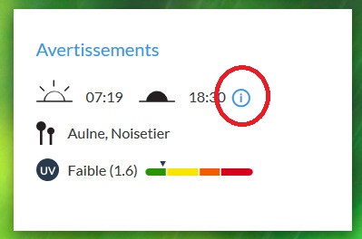 Vous les trouverez dans le cadre des avertissements, sur la home page. Si vous cliquez sur le petit bouton d’infos, vous pourrez consulter un graphique reprenant la durée du jour et le nombre d’heures de luminosité jusqu’au coucher du soleil. Dans ce cadre se trouvent également les avertissements pour les allergies aux pollens et rhumes des foins (source Sciensano).