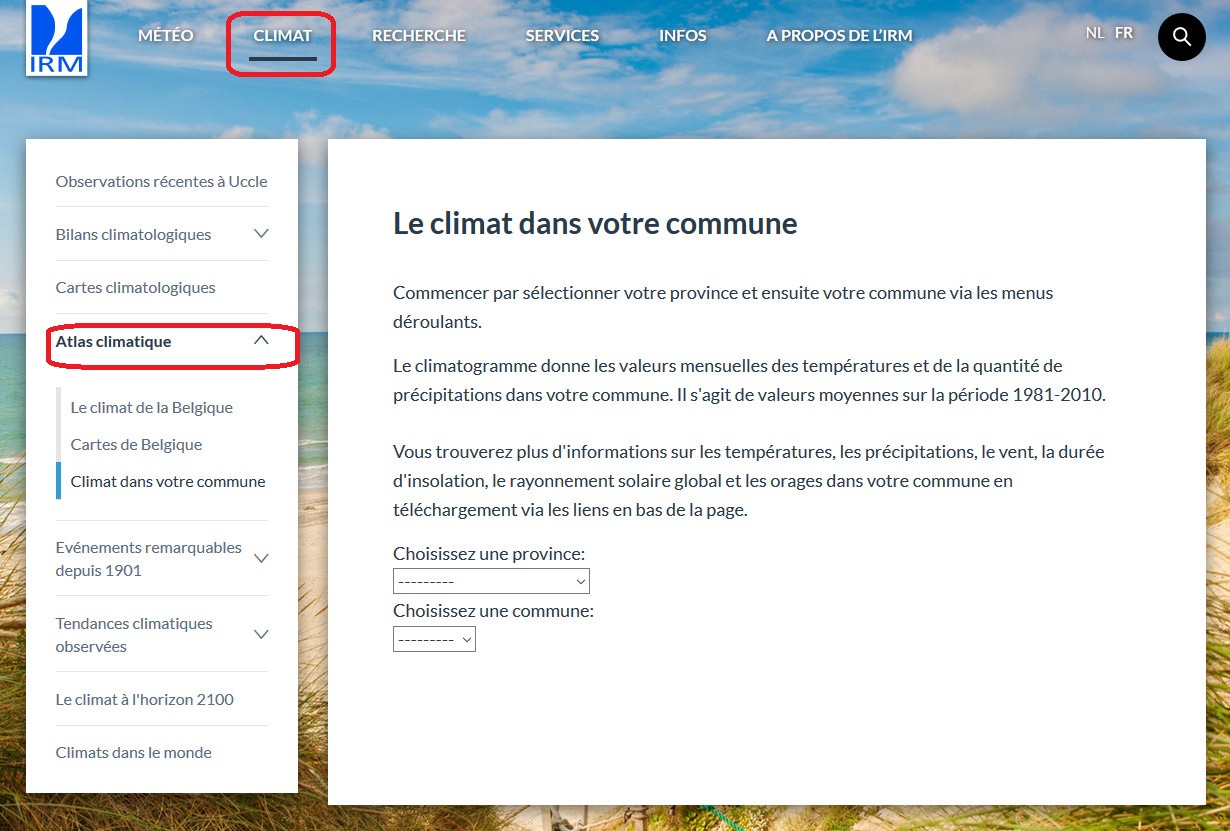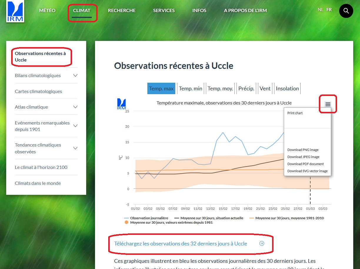 Les observations du mois en cours à Uccle se trouvent sous la rubrique Climat > Observations récentes à Uccle.