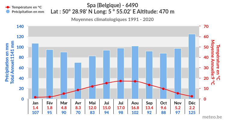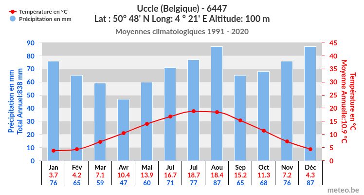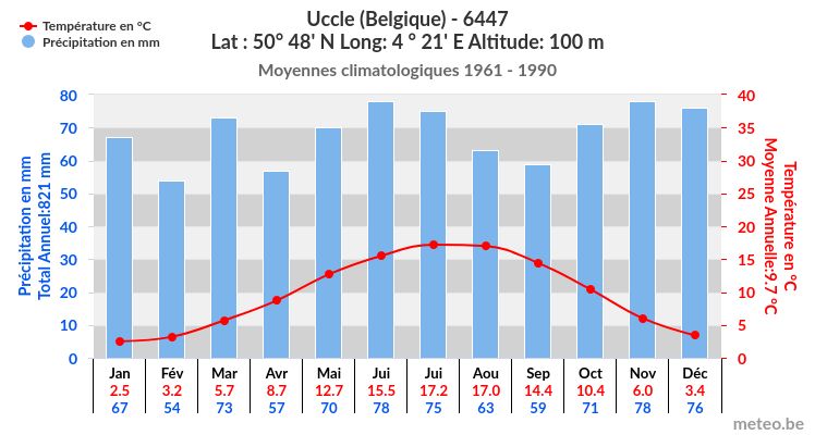 Les données des différents pays ont été rassemblées et mises à disposition par l’Organisation Météorologique Mondiale (OMM). L’IRM a transformé ces données en une représentation sous forme de climatogrammes.