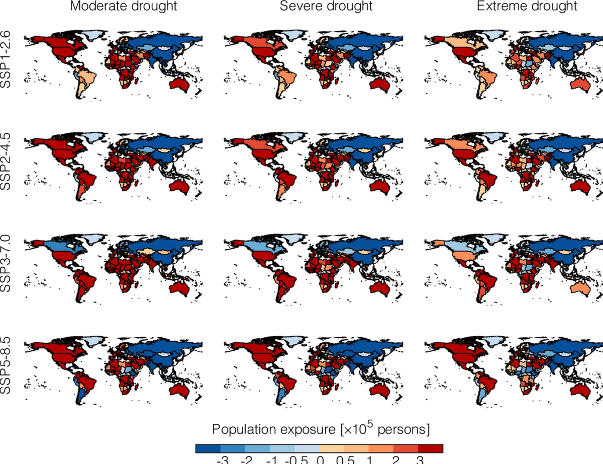 Les auteurs ont combiné de grands ensembles de modèles climatiques et hydrologiques avec des projections démographiques mondiales. Les vagues de chaleur, les sécheresses et les événements combinés de chaleur et de sécheresse ont été quantifiés à l'aide de 26 modèles climatiques mondiaux CMIP6 dans le cadre de multiples scénarios socio-économiques partagés (SSP). L'exposition aux inondations a été évaluée à l'aide de sept modèles hydrologiques mondiaux issus du projet ISIMIP. L'exposition a été définie comme le produit de la probabilité d'un événement et du nombre de personnes touchées, et les résultats ont été regroupés selon les catégories de revenus des pays établies par la Banque mondiale.