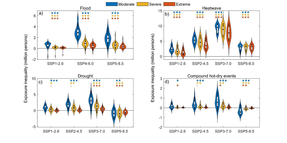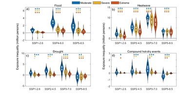 Ensuite, les inégalités en matière d'exposition sont évidentes et souvent importantes. Les vagues de chaleur présentent les inégalités les plus importantes entre les groupes de revenus, tandis que les épisodes combinés de chaleur et de sécheresse présentent les inégalités les plus faibles. Pour les inondations et les vagues de chaleur, les inégalités restent importantes quelle que soit la gravité et le scénario ; pour les sécheresses et les épisodes combinés, leur importance dépend du scénario et de la gravité. Il est à noter que les inégalités diminuent généralement à mesure que les événements deviennent plus extrêmes.