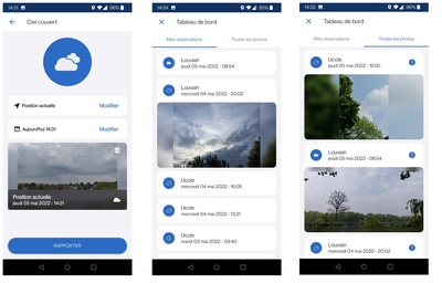 Quelques captures d'écran de la nouvelle fonctionnalité de l'application de l’IRM mise à jour. Une photo météo peut être ajoutée à une observation météo de manière simple et intuitive (capture d'écran à gauche). En outre, un tableau de bord a été ajouté avec soit l'historique complet de vos propres observations des 30 derniers jours ("Mes observations", capture d'écran au milieu), soit un aperçu de toutes les photos météo partagées par les utilisateurs de l'application au cours des dernières 24 heures ("Toutes les photos météo", capture d'écran à droite).