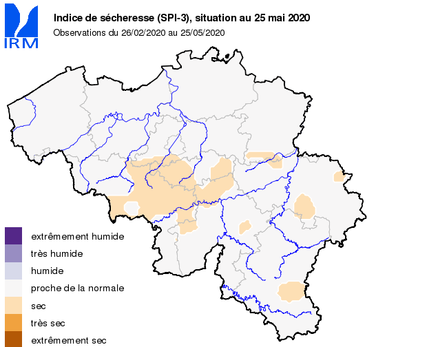 En avril 2020, il n'y a eu que 19 mm de pluie à Uccle, et pour le mois de mai, il n'y a eu que 5,4 mm de pluie jusqu'à aujourd'hui (26 mai). Il faut remonter jusqu'en 1833 pour trouver un mois de mai plus sec, où l’on mesura seulement 1,4 mm de pluie. Dans d'autres régions également, surtout depuis la fin avril, le temps est resté très sec à l'exception de quelques averses (voir figure ci-dessous).